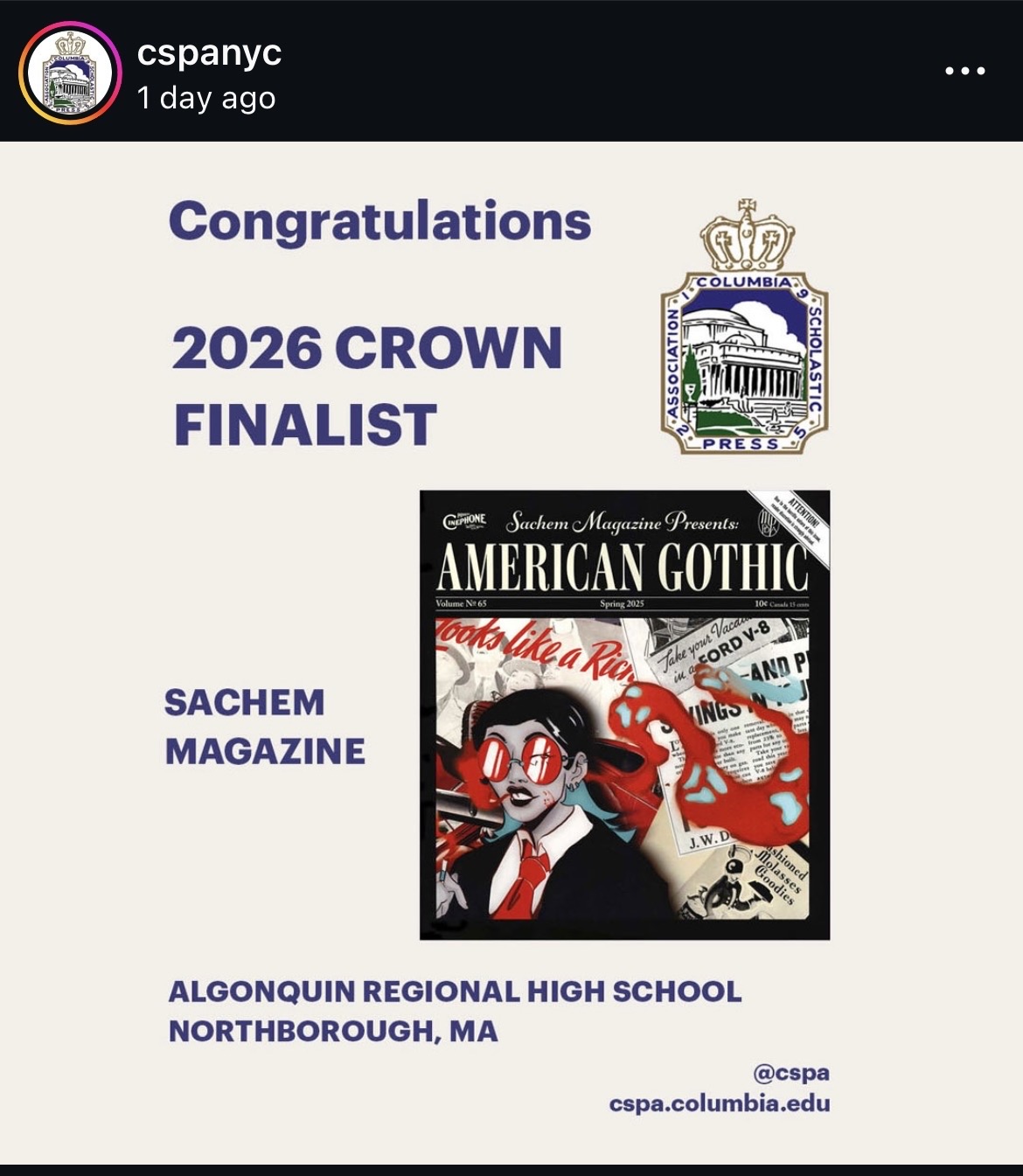 The Gold Crown Awards are the highest recognition given by the Columbia Scholastic Press Association (CSPA) to a student print or digital medium for overall excellence. Algonquin was one of only 12 high schools in the country to receive a gold crown award for its art and literary magazine.